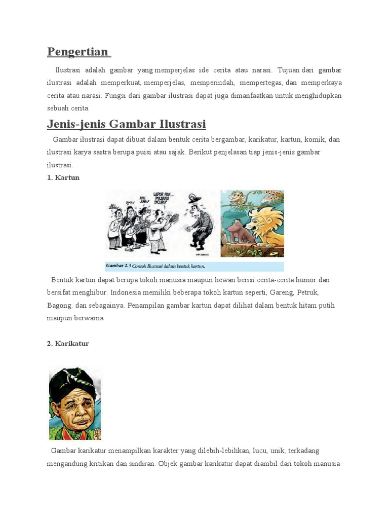 Contohnya adalah pada kemasan suatu produk membutuhkan desain yang menarik agar konsumen tertarik untuk membeli. Gambar juga memiliki berbagai fungsi lainnya seperti sebagai hiasan, tapi yang lebih berguna adalah gambar yang berfungsi sebagai pendukung informasi. Gambar ilustrasi merupakan hasil tulisan dalam bentuk drawing, lukisan, teknik seni rupa dan fotografi dan lebih mengutamakan pada hubungan subyek dan tulisan dibandingkan dengan bentuknya. Gambar ilustrasi corak karikatur adalah gambar sindiran atau kritikan yang dalam penggambarannya mengalami perubahan atau penyimpangan proporsi bentuk. 5 jenis wayang indonesia belindomag via belindomag.nl. Demikian pembahasan tentang teknik gambar ilustrasi: Mempelajari mengenai jenis ilustrasi mulai dari pengertian, gambarnya hingga penjelasan mengenai contohnya secara lengkap. Berbicara tentang pengertian ilustrasi, sebuah seni yang tercipta dengan tujuan untuk memberikan kebahagiaan melalui sebuah keindahan, diperuntukkan agar dapat dinikmati bukan untuk dinilai. Gambar ilustrasi jenis karikatur paling hist download now gambar ilu. Beberapa jenis dari ilustrasi tersebut adalah sebagai berikut : Perlu anda ketahui bahwa salah satu dari fungsi gambar ilustrasi adalah untuk dapat memperjelas maksud dan makna dari cerita dengan. Sejarah, pengertian menurut para ahli, manfaat, media, fungsi, tujuan, jenis. Ada lima jenis gambar ilustrasi yang biasa digunakan dalam sebuah cerita, diantaranya adalah kartun, karikatur, komik, ilustrasi karya sastra, dan vignette.